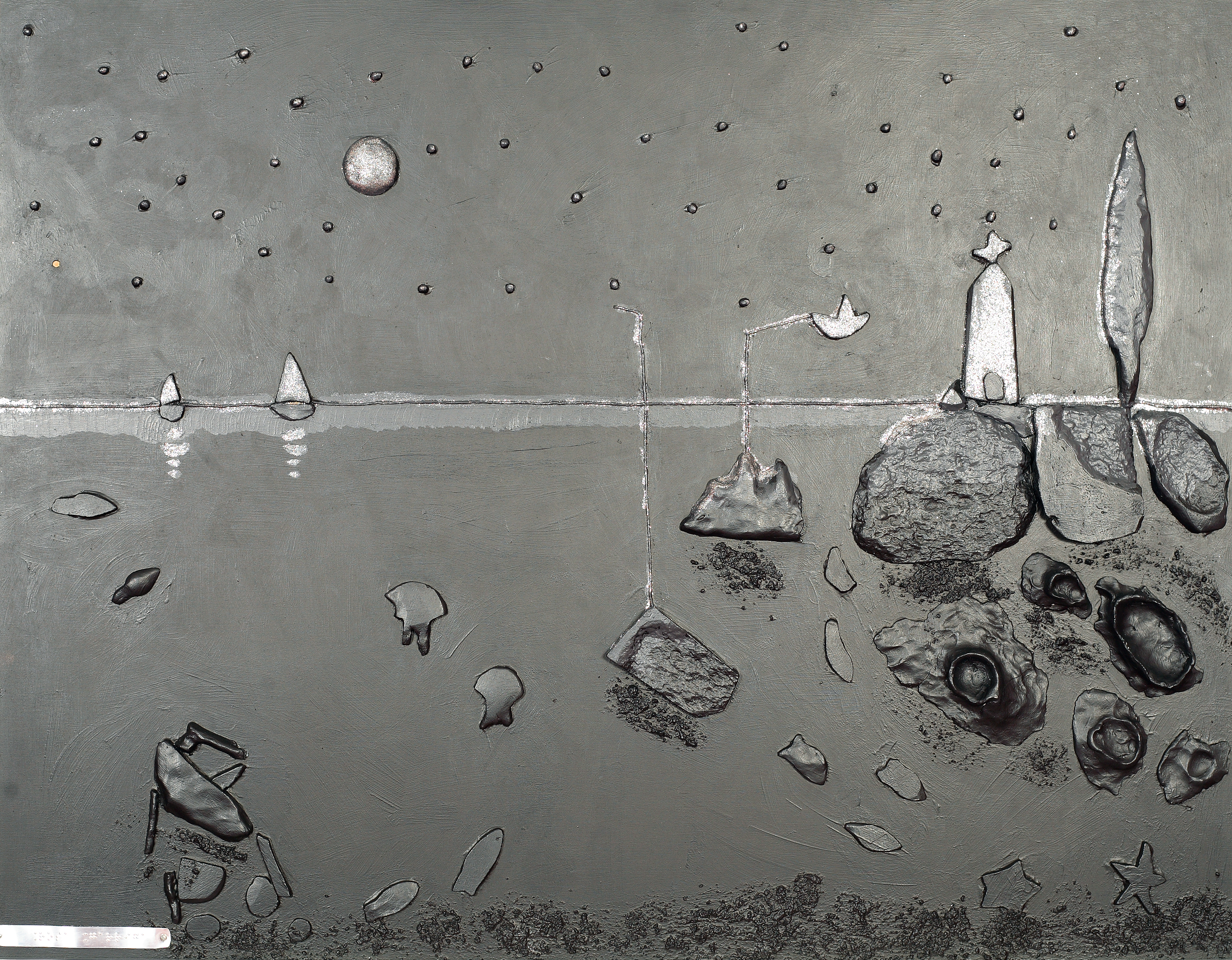 Cuadro en relieve de la artista afiliada Rosa Garriga, titulado La ermita y el progreso.
