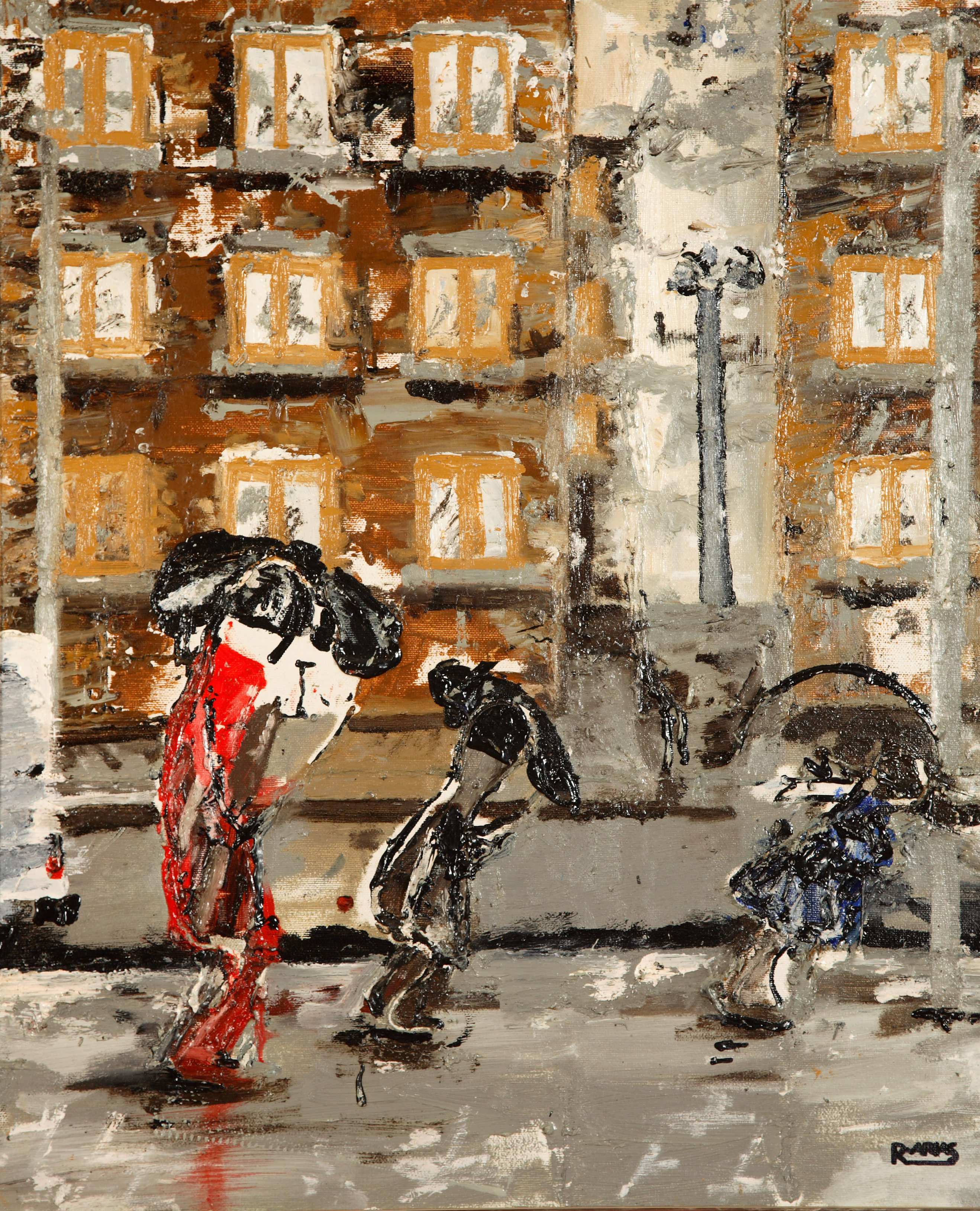Óleo realizado por el pintor afiliado Rafael Arias titulado Lluvia en la ciudad